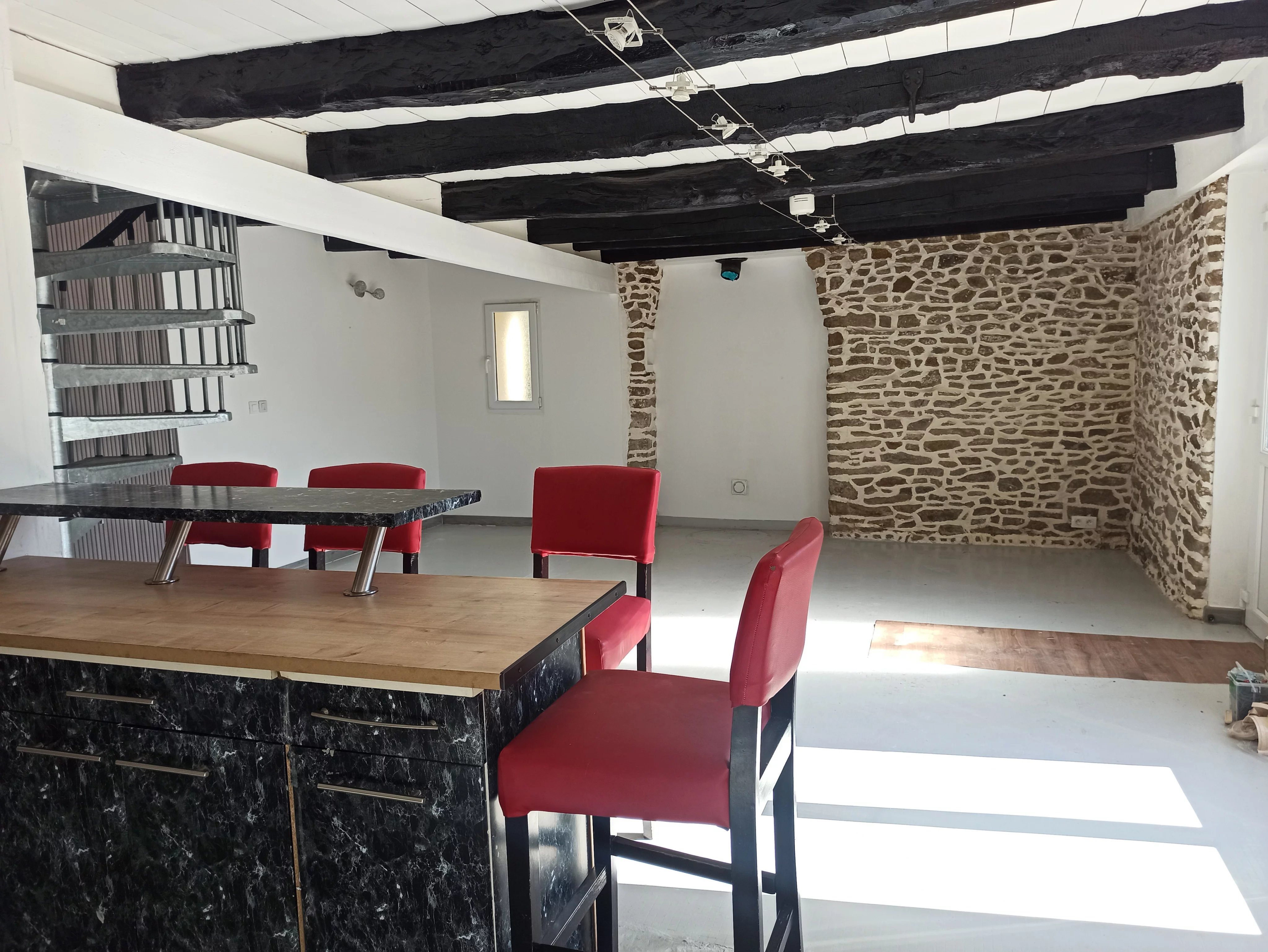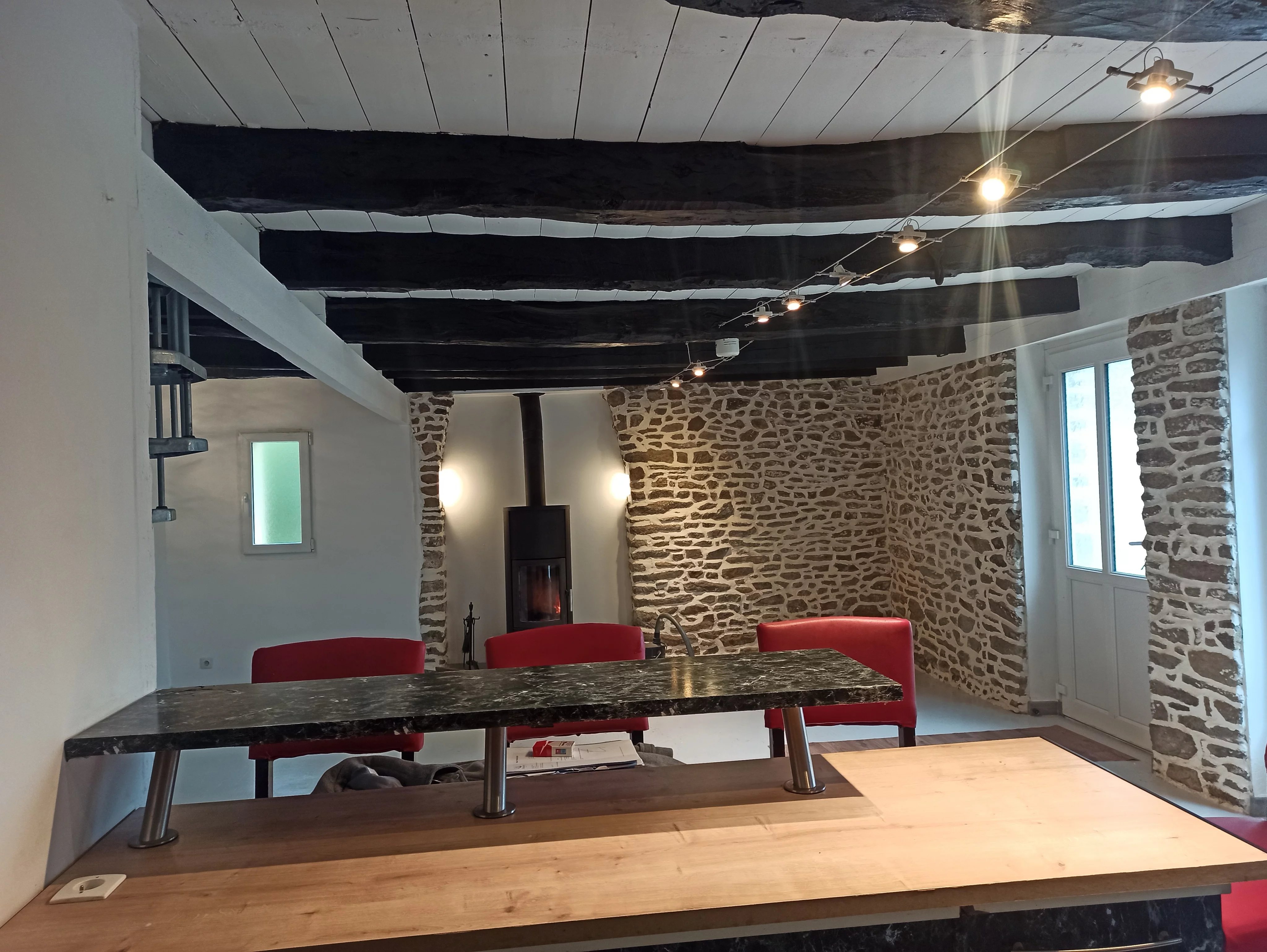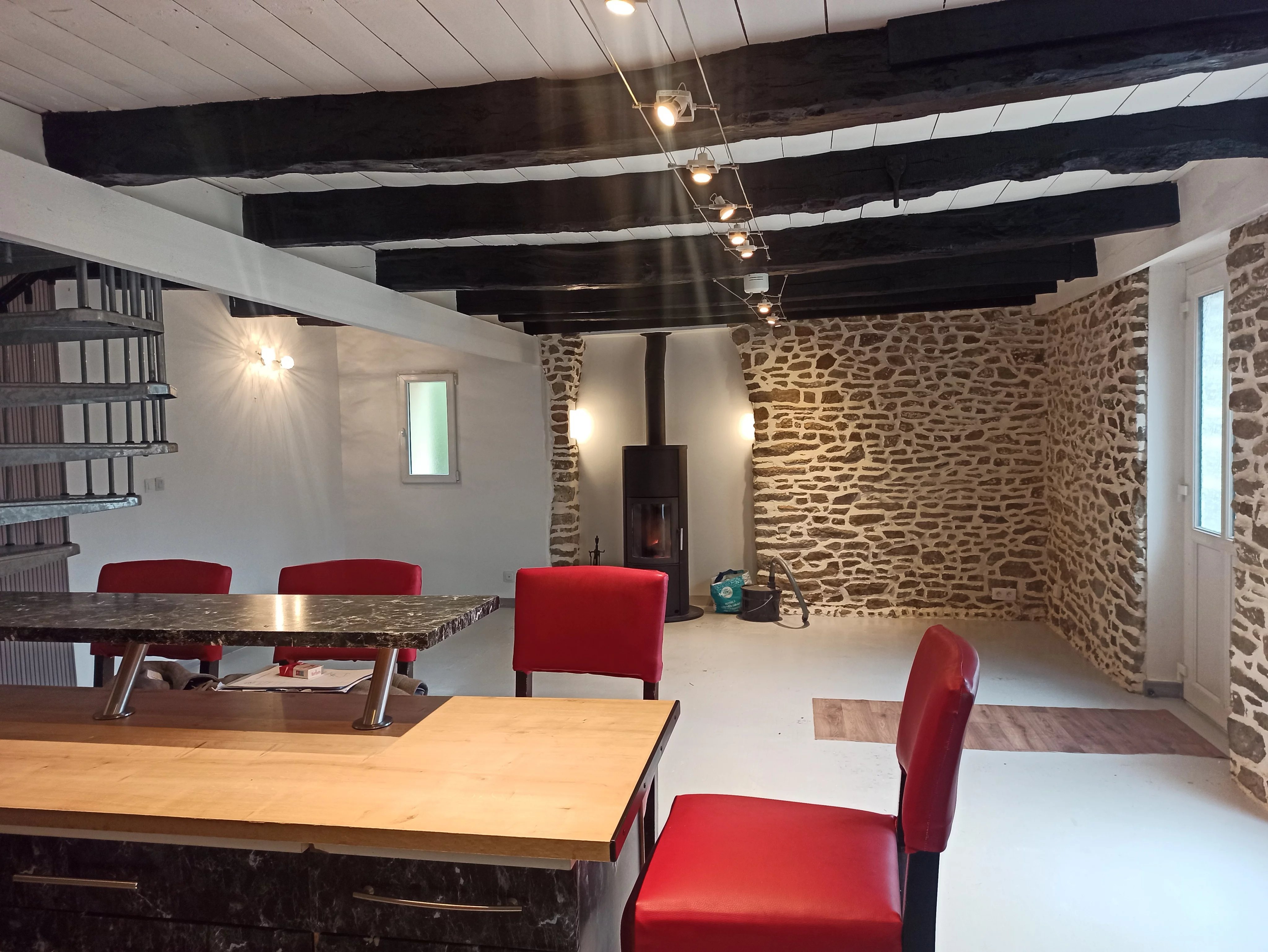 une belle pièce de vie avec possibilité d’installer un poêle à bois pour le confort et la convivialité de la pièce.